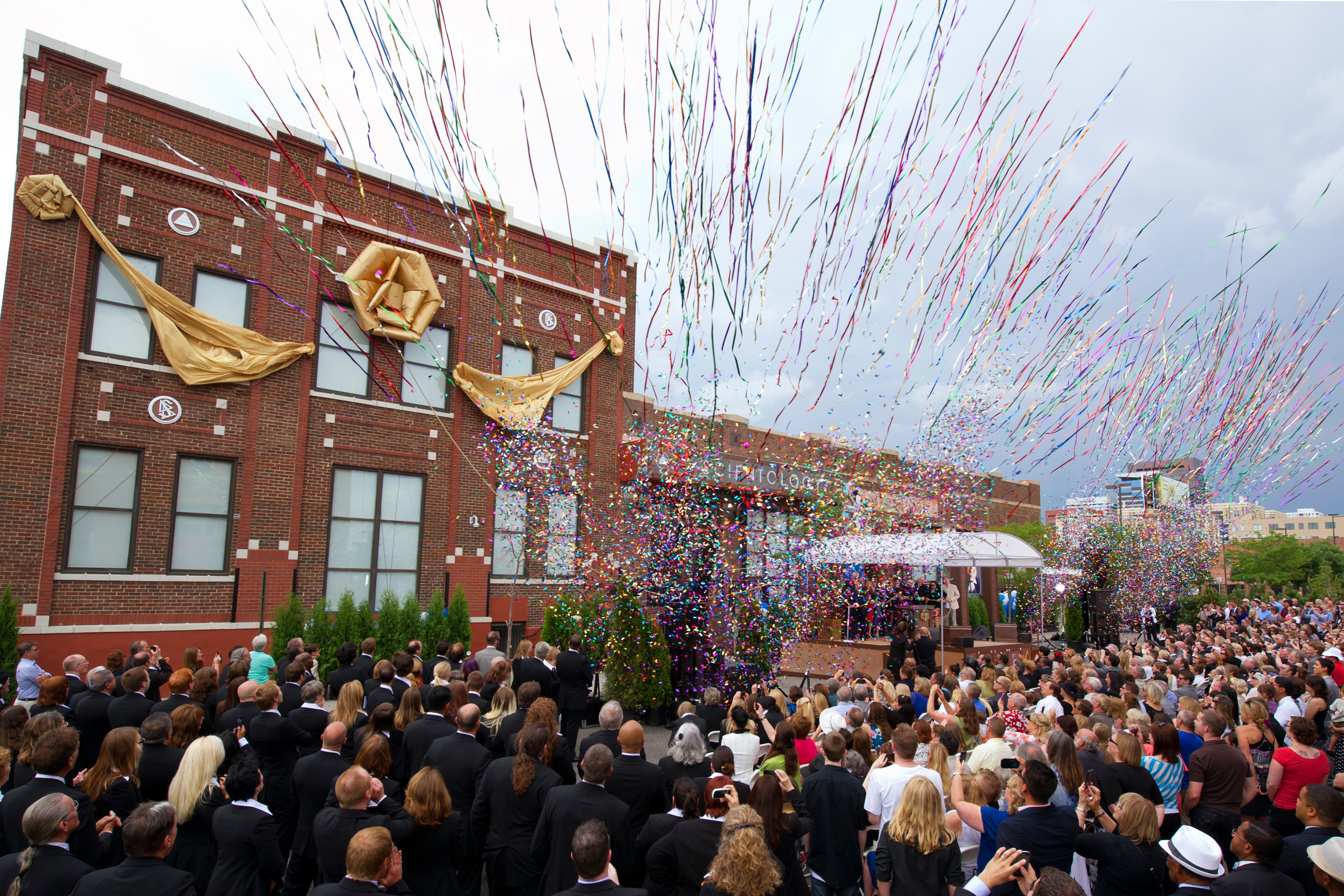 Les Scientologistes et leurs invités sont rejoints par des représentants de l’État et de la ville à un pâté de maisons de Coors Field, stade de baseball, pour inaugurer une nouvelle église de Scientology à Denver.