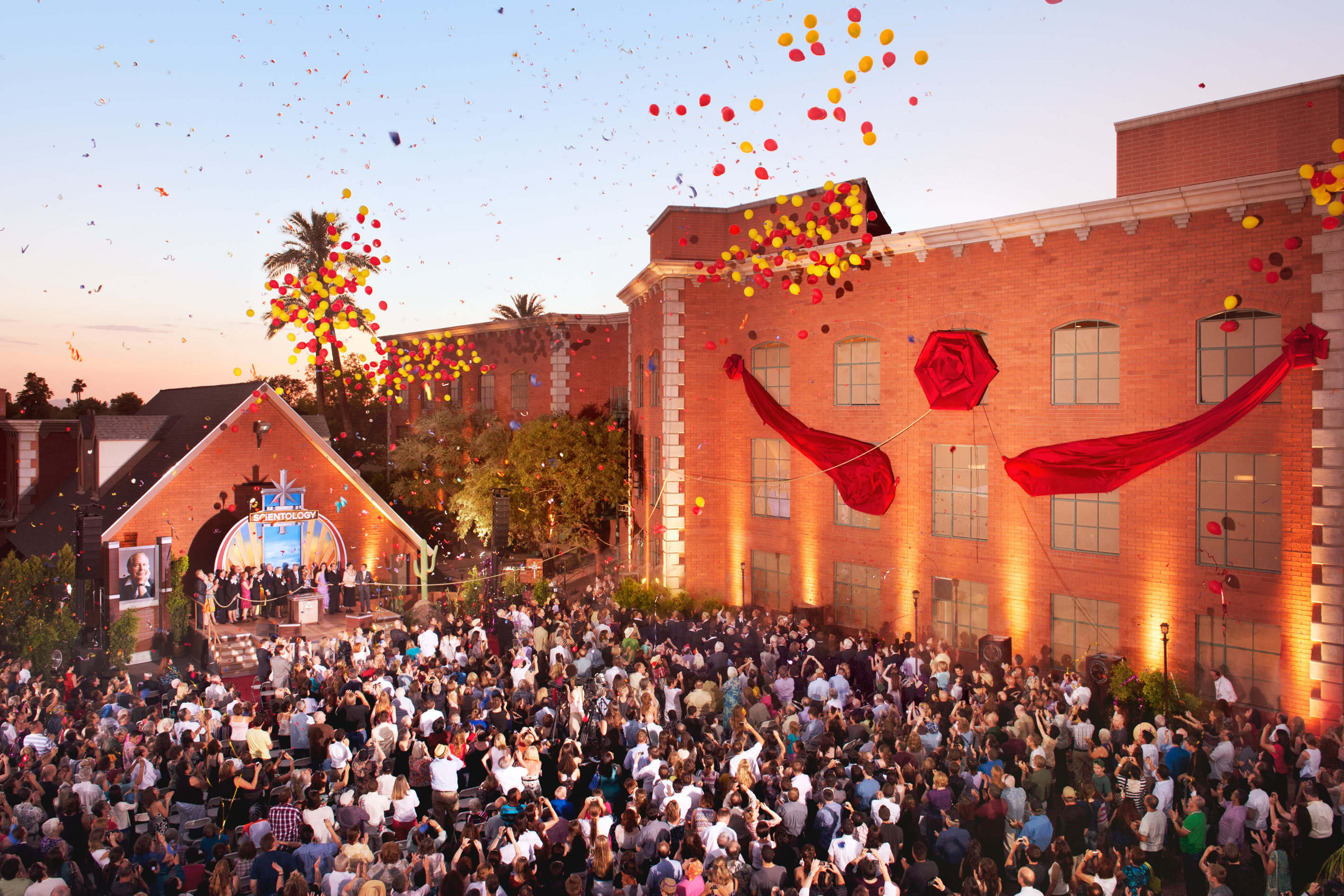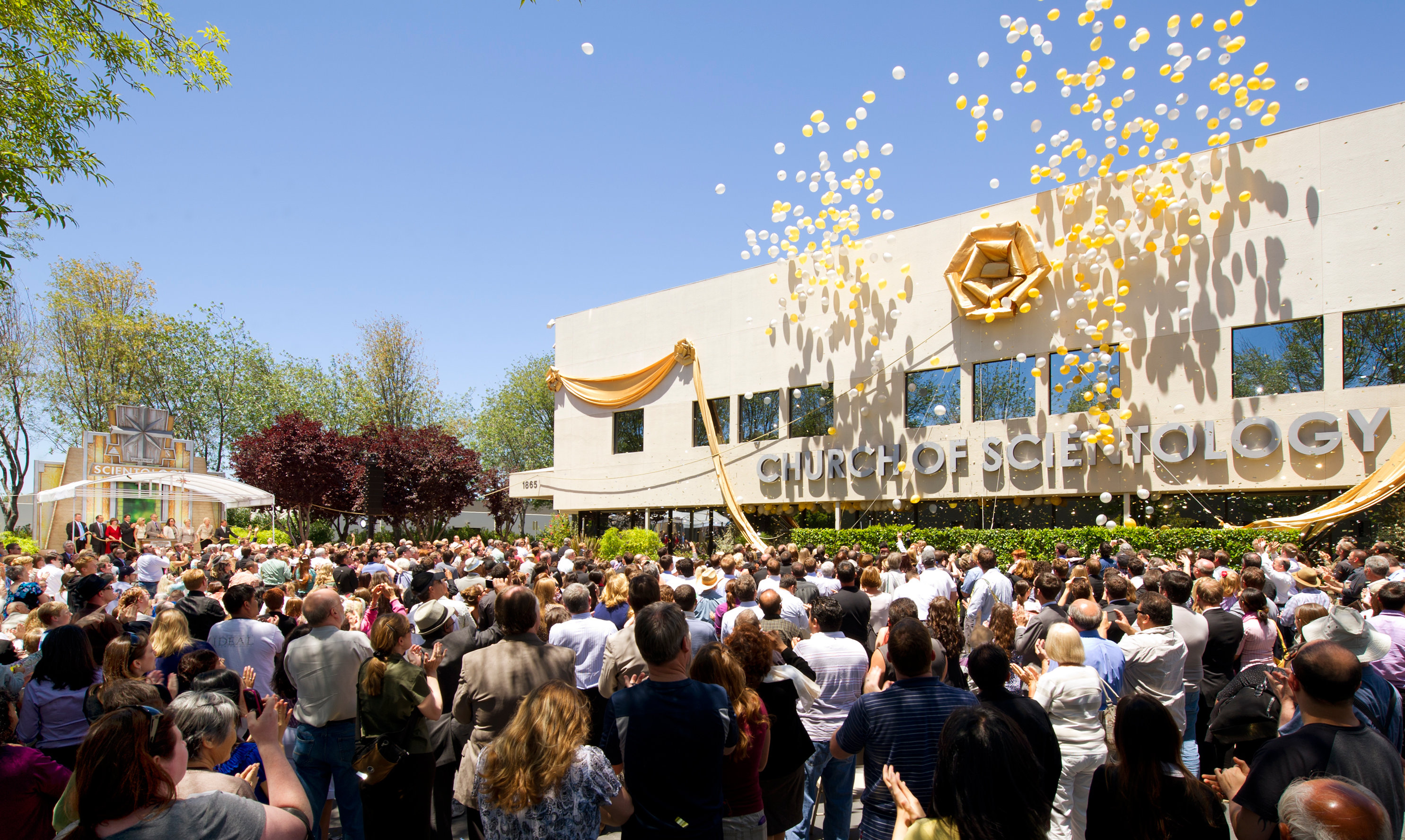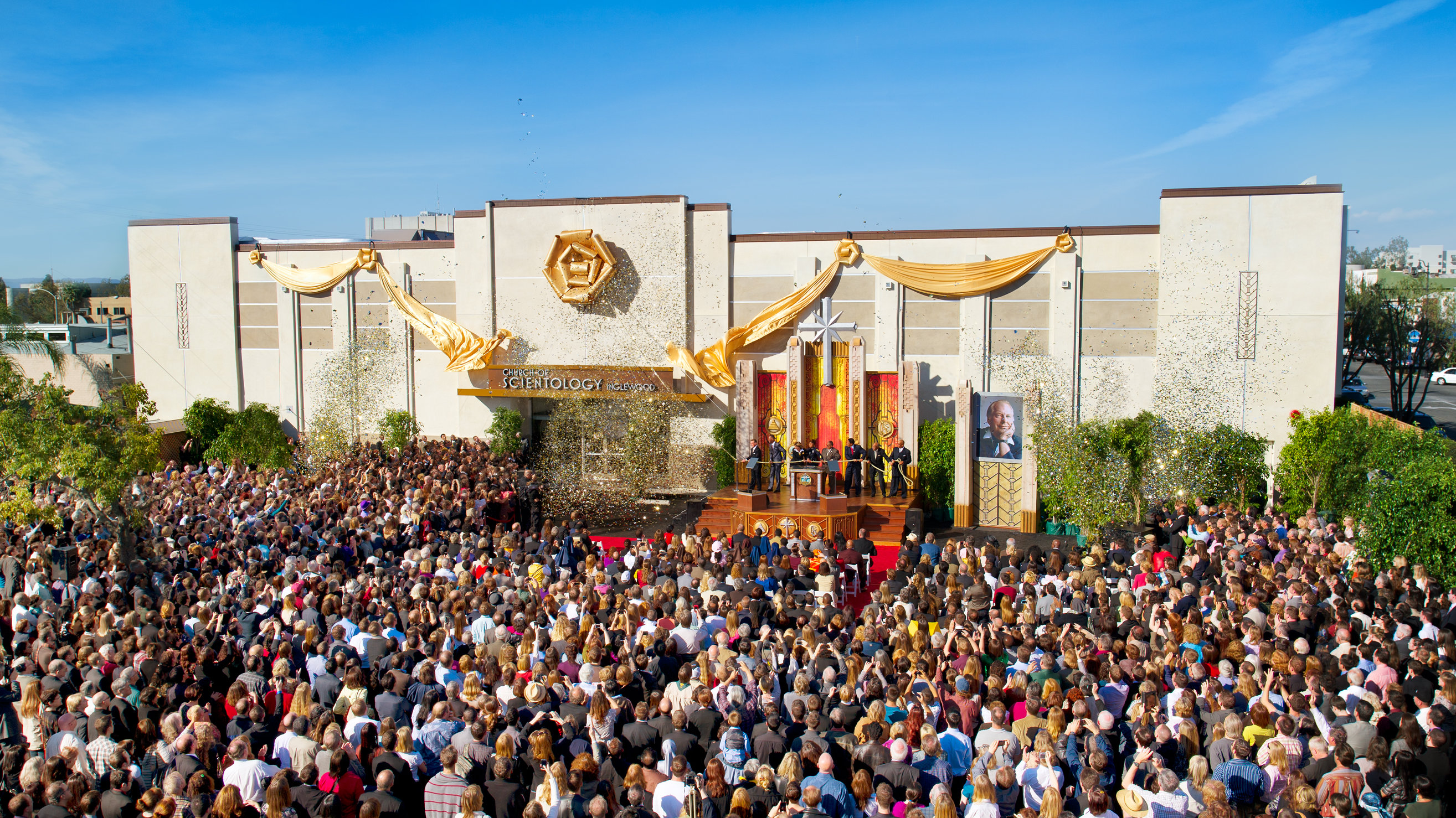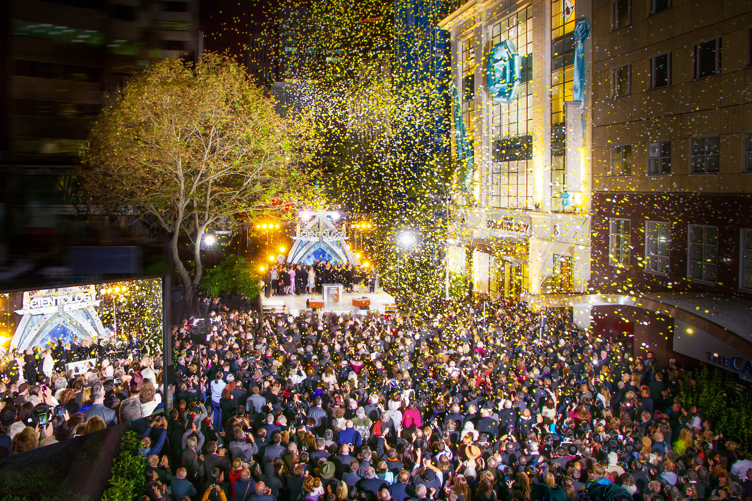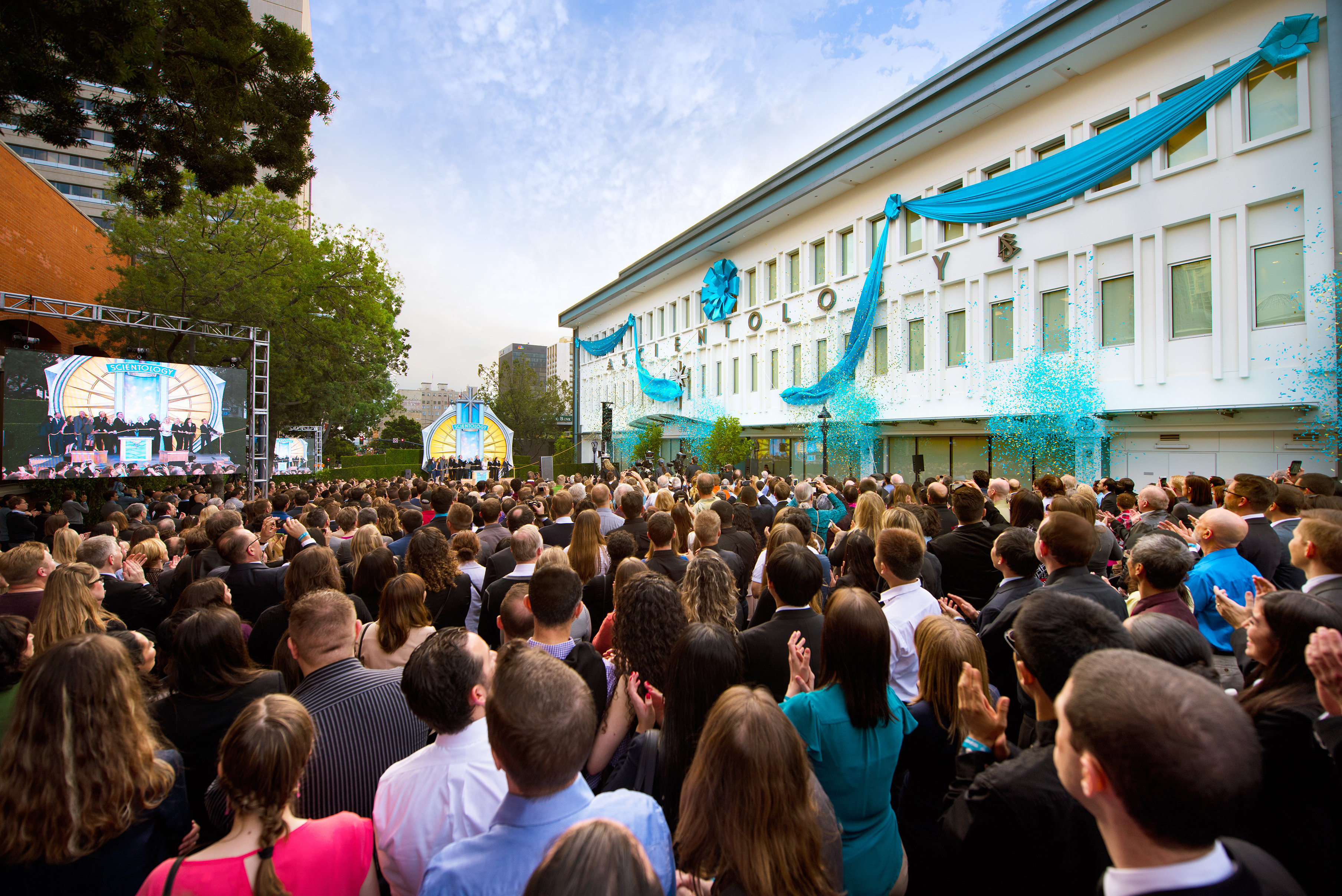 Dans le quartier animé de la vieille ville, des milliers de personnes se rassemblent avec impatience pour assister à la chute du ruban sur un bâtiment historique entièrement restauré et nouvelle église de Scientology de Pasadena.